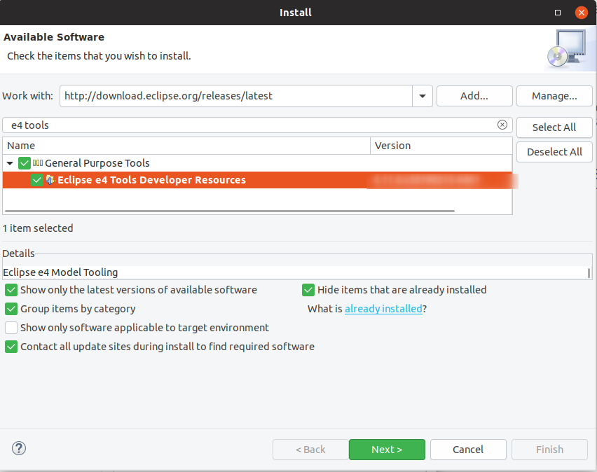 e4 tool은 Eclipse RCP와 Eclipse IDE plug-ins를 개발하기에 아주 유용한 툴입니다. suggested Eclipse SDK download에 있습니다.