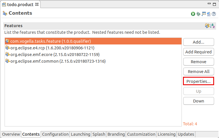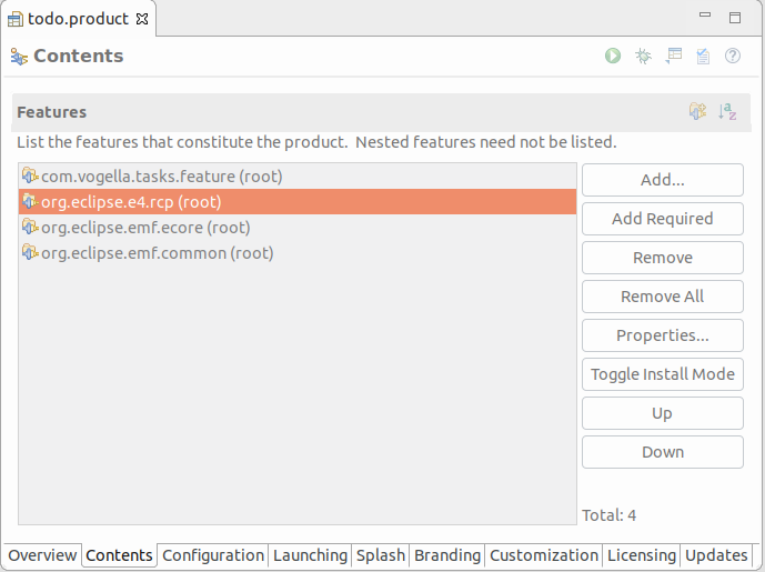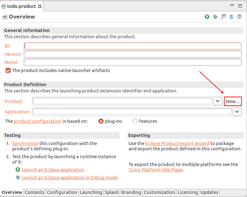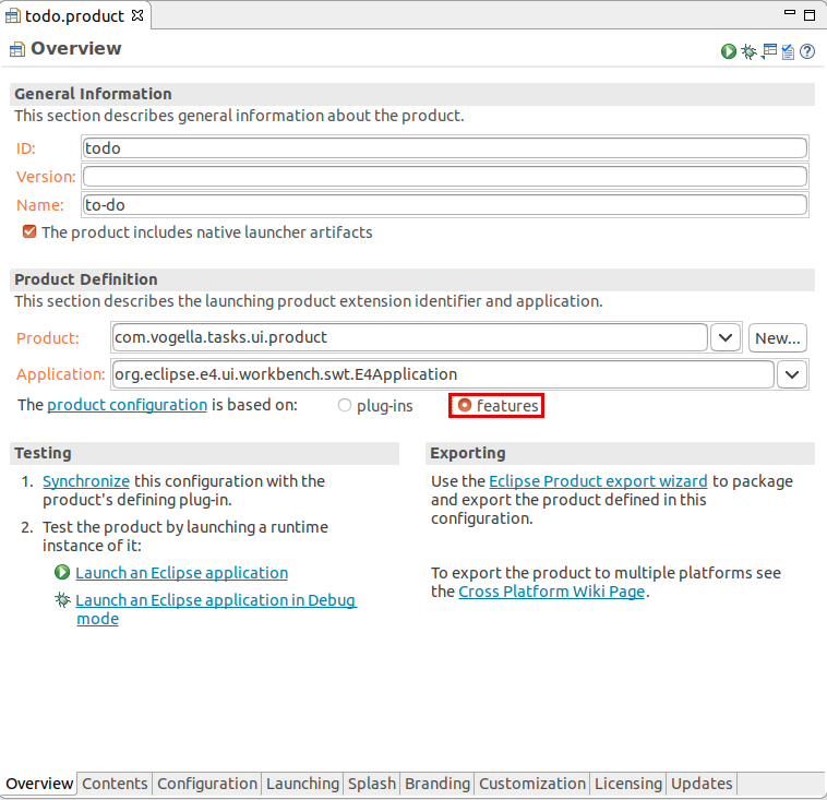 todo.product 파일을 열고, feature 사용을 위해 product configuration 파일을 변경합니다. product editor의 Overview 탭에서 [features] 옵션을 선택하면 됩니다.