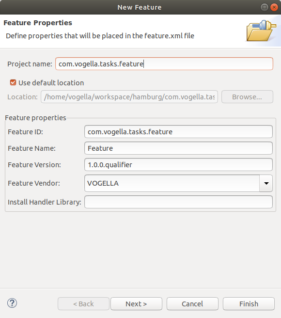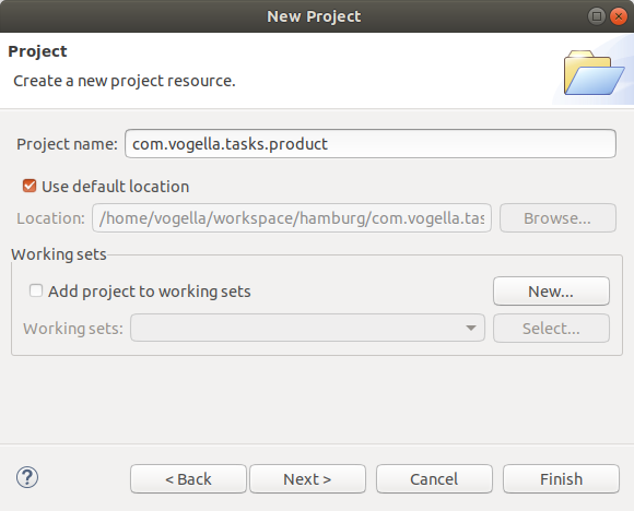 프로젝트 명으로 com.vogella.tasks.product를 입력하고, [Finish] 를 누릅니다.