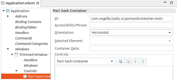 이것의 Orientation 속성을 Horizontal로 변경하고, ID field에 com.vogella.tasks.ui.partsashcontainer.main로 값을 설정하세요.