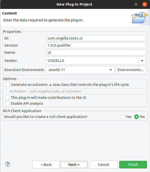 첫번째 wizard page에서 com.vogella.tasks.ui 를 project 이름으로 입력하고 [next] 누르기