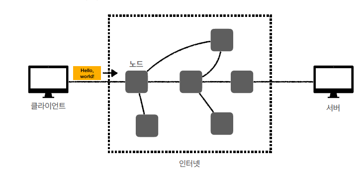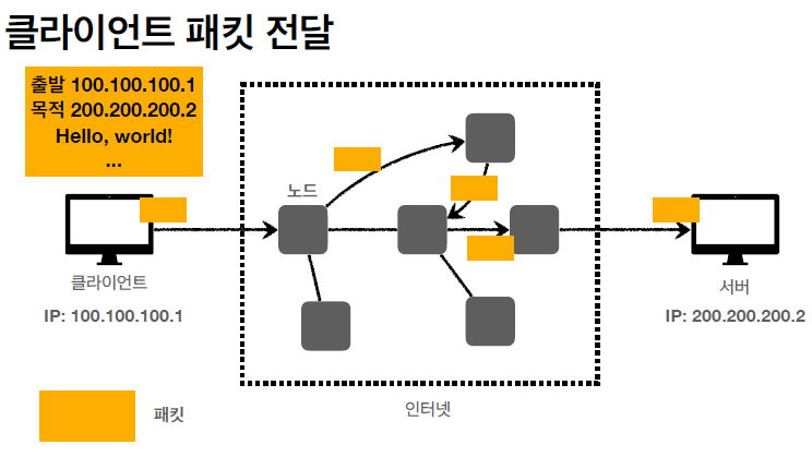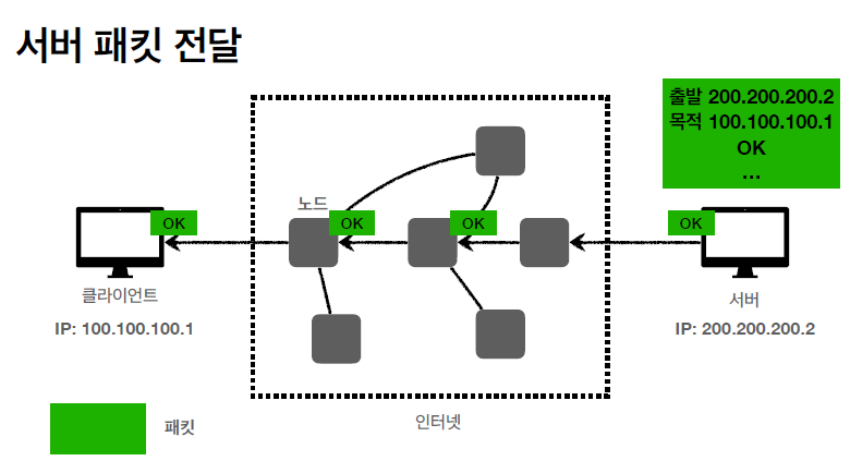 - 패킷을 작성해서 인터넷 망에 던지면, 서버 노드들이 규약에 따라 전달해 준다.(모든 노드는 IP프로토콜 규약을 따르고 있음)