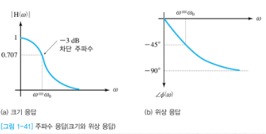 크기응답은, -3dB( 1-> 0.707 = 1/√2), 위상은 -45도가 된다.