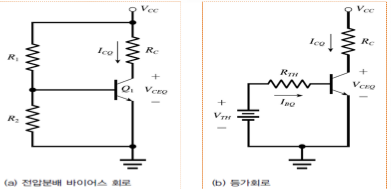위의 고정바이어스에서 발전된 형태이다. 저항 1개(RB)로 bias하던걸 2개(R1,R2)로 분배의 형태를 가지게 만들었다.