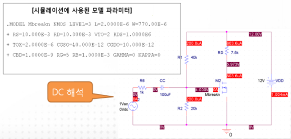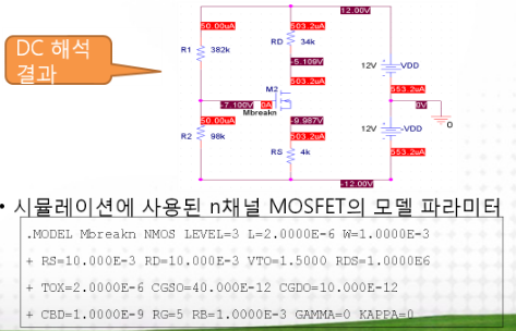 VDS가 유효게이트전압(2V)보다 높아서 포화영역 Bias임이 확인됨.
