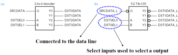 2-to-4 74x139 binary decoder used as 1-bit input, 4 output demultiplexer